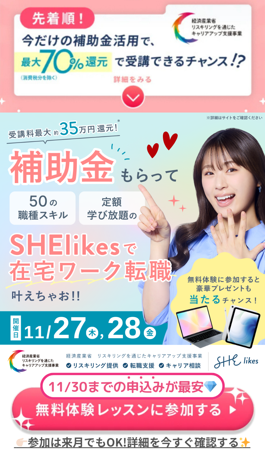 | SHElikes | Webスキルを活かして自分らしく起業したい女性 | 月額制+入学金 |